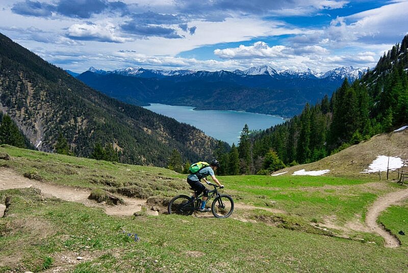 Auf dem Snakeline Trail zum Walchensee Jetzt heißt es Schoner an und Dämpfer auf, denn ab jetzt beginnt der Trail, der uns zurück zum Walchensee bringt.