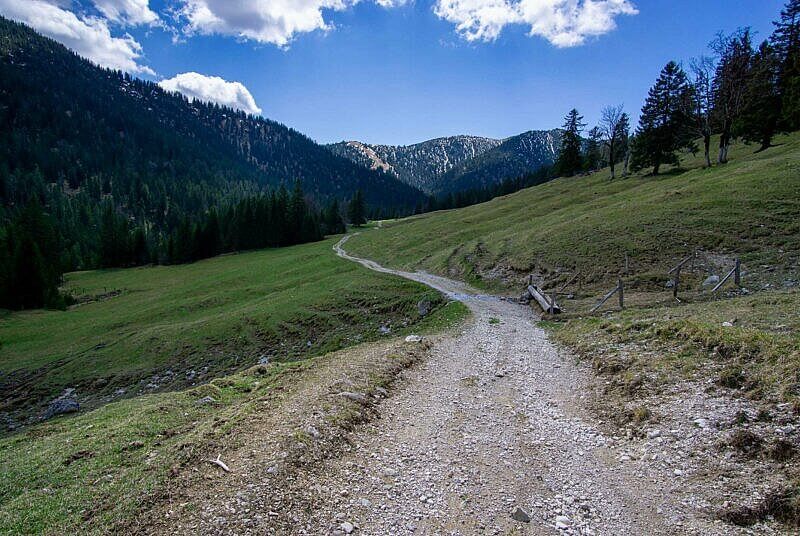 Am Fuße des Rotenkopf und mit stetigem Blick auf den Wank nähern wir uns der Esterbergalm. Spätestens hier wird es höchste Zeit für eine Einkehr. Schon wenig später warten schließlich zwei spannende Trails auf dich.